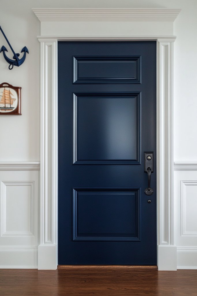 Incorporate decorative trim or wainscoting painted in a contrasting white for a classic look. Add textured or patterned wallpaper around the door frame for extra visual interest. Customize hardware with vintage or modern styles to match your decor. You can also experiment with different shades of navy to find the perfect tone for your space.