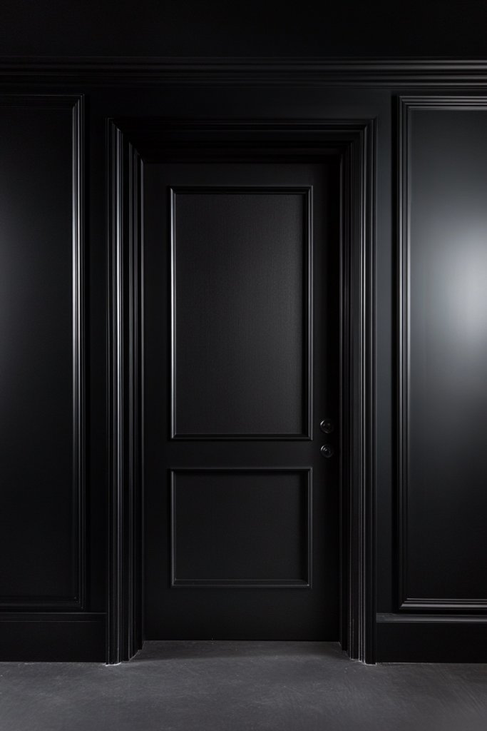 Visualize a sleek, matte charcoal door contrasted against light walls, with metallic hardware catching the light. The deep hue makes the details pop, whether it’s paneling or beveled edges. Shadows play across its surface, emphasizing its bold presence. The texture feels velvety and smooth, adding tactile interest to the visual drama.
