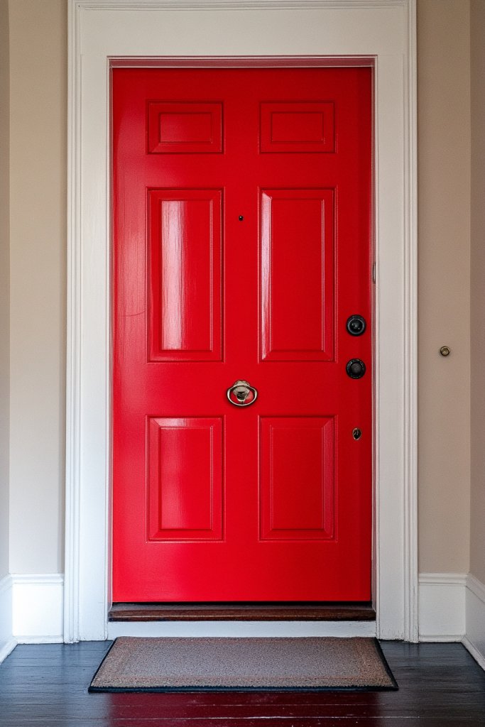 Imagine a vibrant red door with a glossy finish, catching the light and drawing admiration. The color pops against neutral walls, creating a focal point that energizes the entire space. Complemented with vintage brass or matte black hardware, it exudes both warmth and attitude. The shiny surface reflects ambient light, making the color appear even more vivid and inviting.