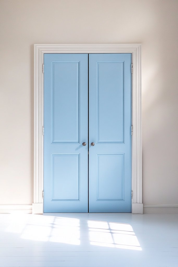 Pale blue doors suit coastal, shabby chic, or Scandinavian decor styles. They work well in bedrooms or bathrooms where a calming effect is desired. Add cozy textiles like plush throws or linen curtains in complementary shades. Seasonal updates might include soft pastel accessories or layered textiles to keep the look fresh and inviting.