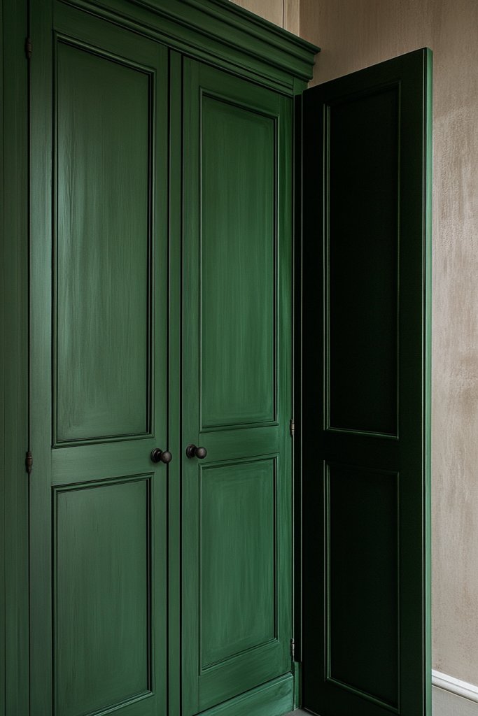 Visualize a set of deep green doors with a matte finish, nestled among natural wood accents and light-colored walls. The rich hue adds depth and character, creating a soothing focal point. Shadows and light play across the surface, emphasizing the textured panels or beveled edges. It’s like stepping into a quiet woodland scene, right at home.
