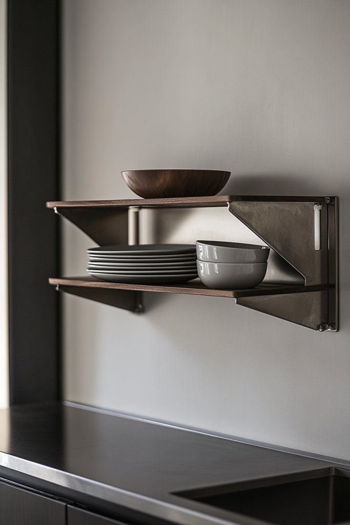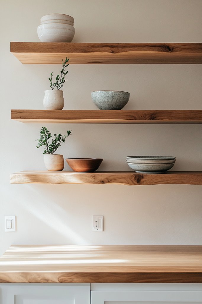 Imagine delicate, floating shelves made from light, natural wood mounted against a soft neutral wall. Small ceramic bowls and neatly stacked dishware sit perfectly aligned, creating harmony. The smooth grain of the wood contrasts beautifully with matte black hardware, adding a modern touch. The sunlight filters gently, highlighting the textures and keeping the space airy and inviting.