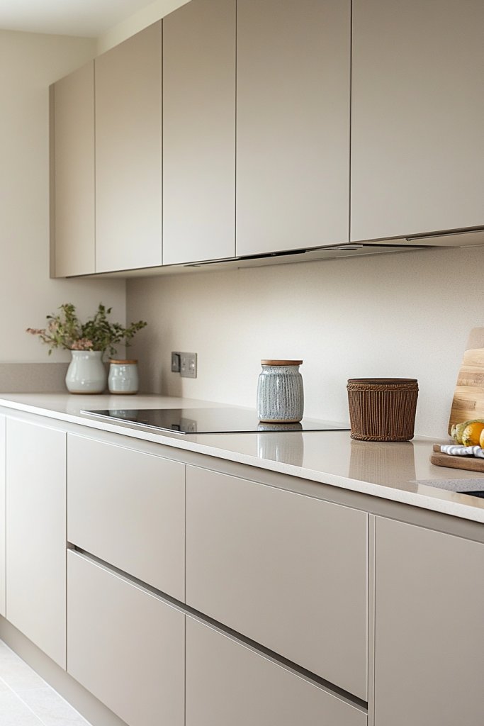 Visualize smooth, matte-finish cabinets in shades of soft beige or muted grey, with integrated grooves or push-to-open systems. The absence of hardware creates a seamless, cohesive surface that feels calm and refined. The gentle curves or flat fronts enhance the minimalist aesthetic, while hidden mechanisms keep the look sleek and clutter-free.