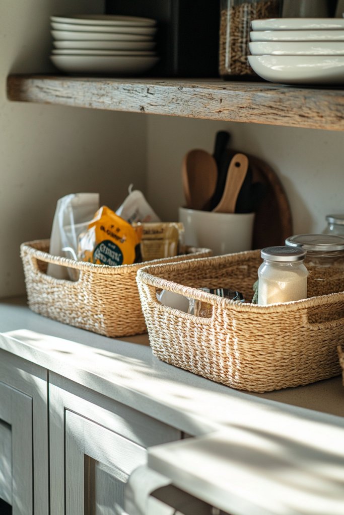 Mix different sizes and shapes to accommodate various items, keeping the look dynamic yet cohesive. For seasonal updates, swap in darker or lighter fibers or add colorful textiles inside. Use them in open shelves, under the sink, or inside cabinets—anywhere you want a touch of organic texture. They’re also a good choice for kids’ kitchens, providing easy-to-access storage.