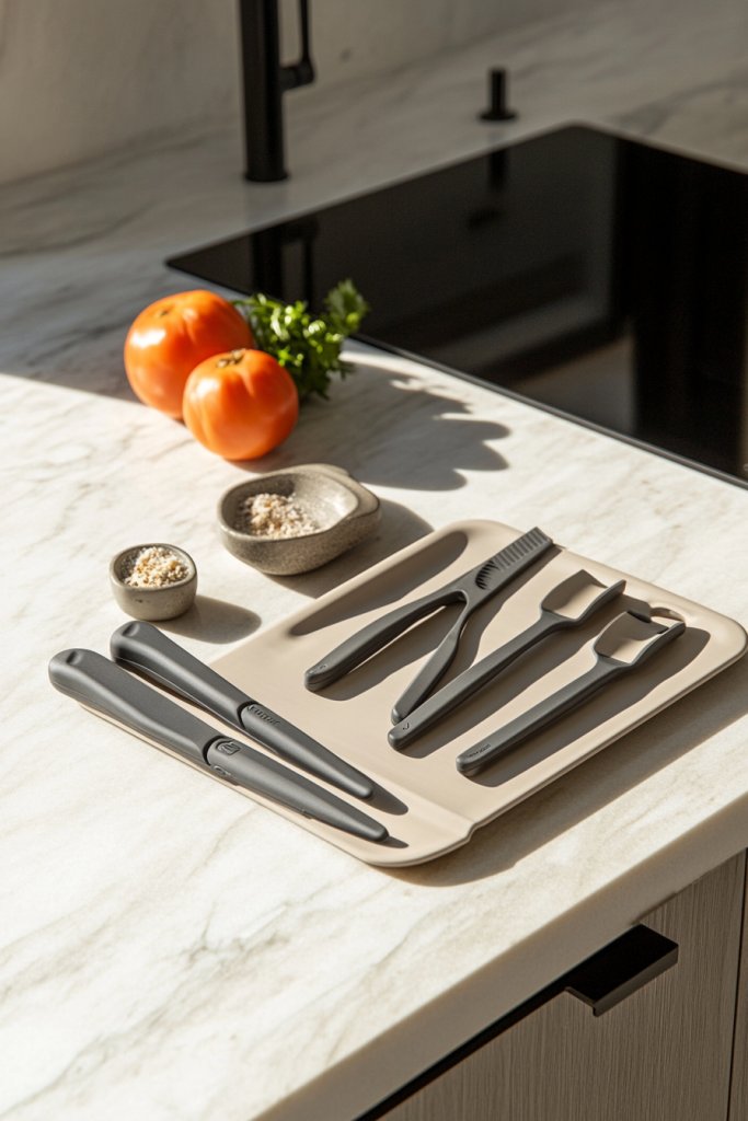 Imagine a sleek, stainless steel utensil set that combines spatula, tongs, and spoons into a single compact handle. Or a foldable cutting board that slides neatly into a drawer after use. These tools are designed to be lightweight, easy to store, and visually unobtrusive. When in use, they elevate the cooking experience while maintaining a tidy countertop.