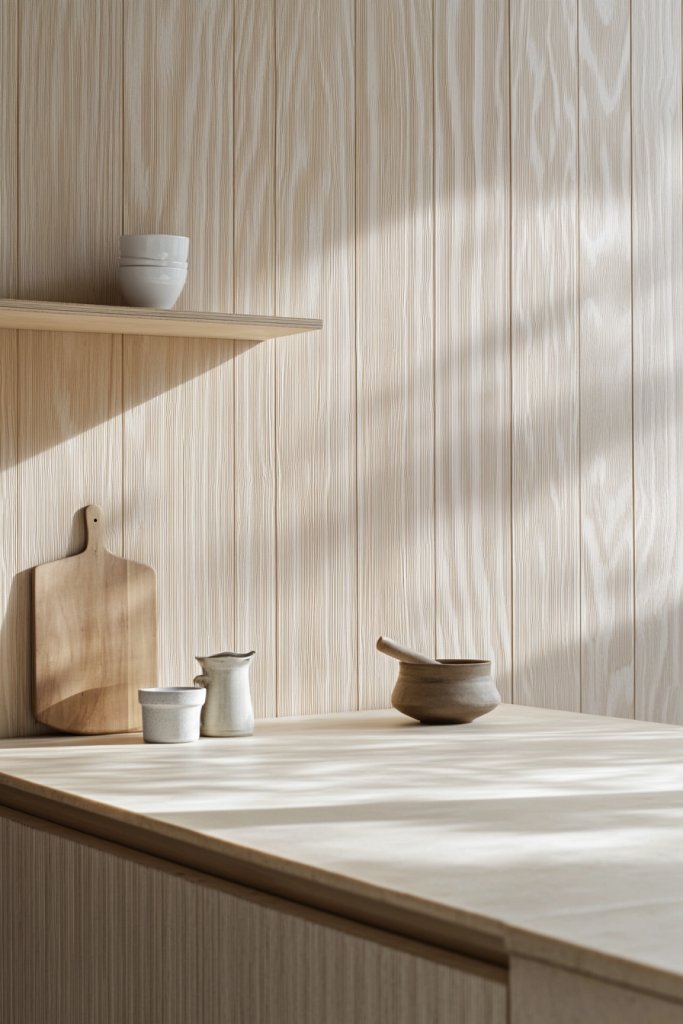 Opt for light wood finishes like ash or pine to keep the look airy. You can install the paneling on a single wall or extend it across the entire room for more impact. Combine with minimalist cabinetry and simple fixtures, avoiding ornate details. Seasonal accents could include textured textiles or soft lighting to highlight the paneling’s warmth.