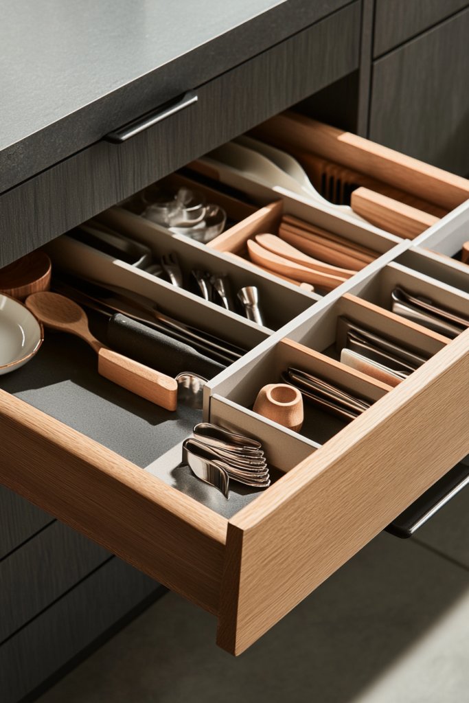 Picture sleek, matte-finish plastic or bamboo dividers that slide into your drawers effortlessly. Each section holds a specific category—knives, spoons, chopsticks—keeping everything orderly and visually balanced. When drawers are opened, the tidy arrangement instantly communicates calm and control. The uniformity of the dividers complements the minimalist aesthetic perfectly.