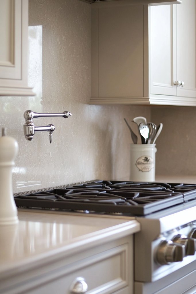 Picture a kitchen painted in soft taupe, with matching cabinets and backsplash tiles. The countertops are a textured ceramic in a slightly darker hue, adding depth. Wooden accents like a cutting board or a small sculpture complement the warm palette. Ambient light bounces softly off matte surfaces, enhancing the cozy, inviting atmosphere.