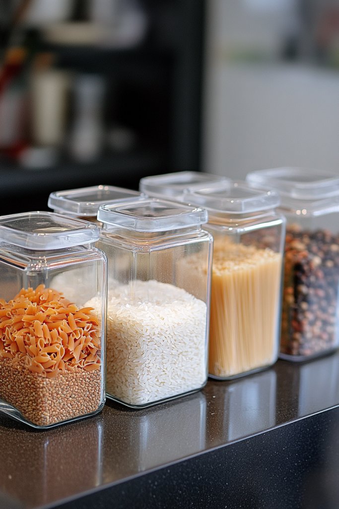 Imagine a row of matching glass jars filled with dried pasta, rice, or coffee beans, lined up on open shelves or inside cabinets. Their transparent bodies reveal vibrant colors and textures, adding a subtle visual cue of abundance. Silver or bamboo lids add a minimalist touch, completing a cohesive, calm look. When sunlight hits them, the contents shimmer softly, inviting you to cook.