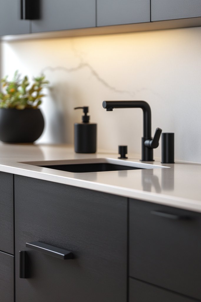 Envision matte black faucets and handles against soft, neutral cabinetry. The dark accents create a striking visual anchor, especially when paired with light-colored countertops and walls. Subtle reflections on matte surfaces add depth, while the contrast emphasizes clean, geometric lines. The overall effect is both sophisticated and contemporary, with a hint of industrial charm.