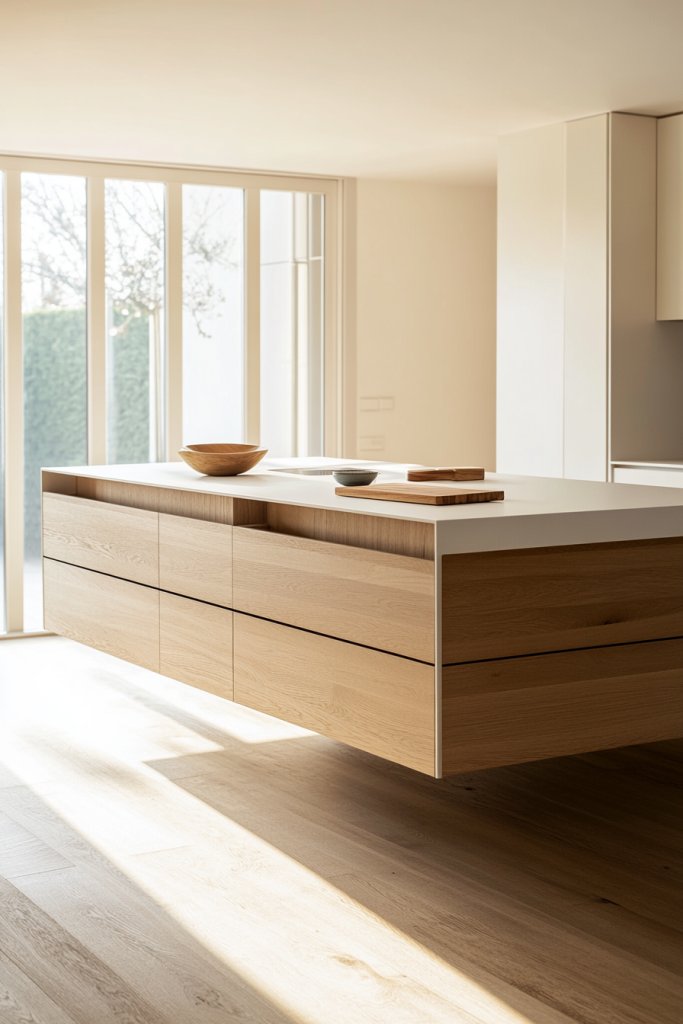 A bulky, traditional kitchen island can feel heavy and cluttered, especially in minimalist spaces. A floating island offers a sleek, airy alternative that maximizes workspace without weighing down the room. It’s perfect for open-plan layouts where light and space are key.
