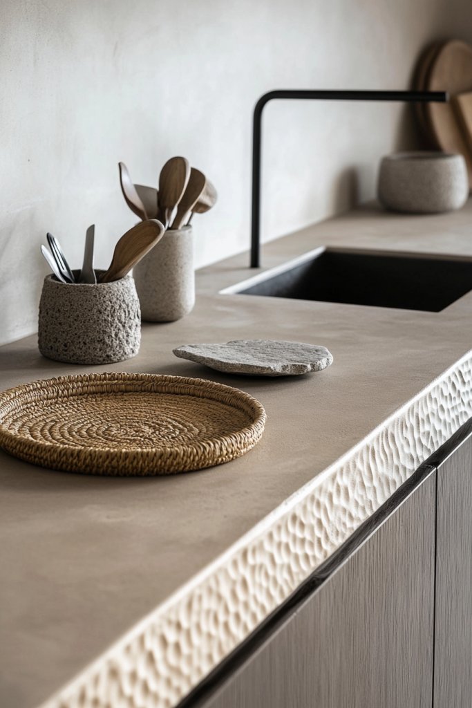 Complement textured surfaces with simple, sleek accessories like stainless steel or matte black utensils and containers. Incorporate subtle color contrasts through textured textiles or mats. When cleaning, use gentle, pH-neutral cleaners to preserve the surface’s integrity. Add a textured cutting board or a handcrafted ceramic jar to bring warmth and personality.