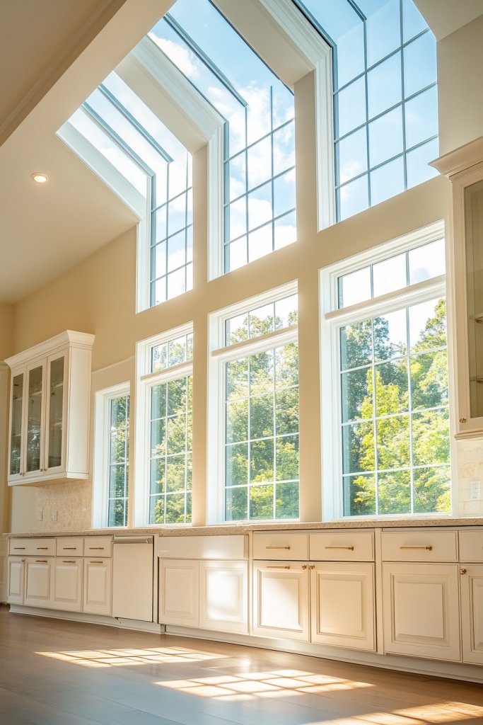 Work with a professional to install large, energy-efficient windows and skylights. Ensure proper insulation and sealing to avoid drafts. Use low-maintenance, UV-resistant glass to keep sunlight bright without fading interior finishes. Position windows to maximize natural light during peak hours and minimize glare. Incorporate external shading devices if needed to control harsh sunlight.