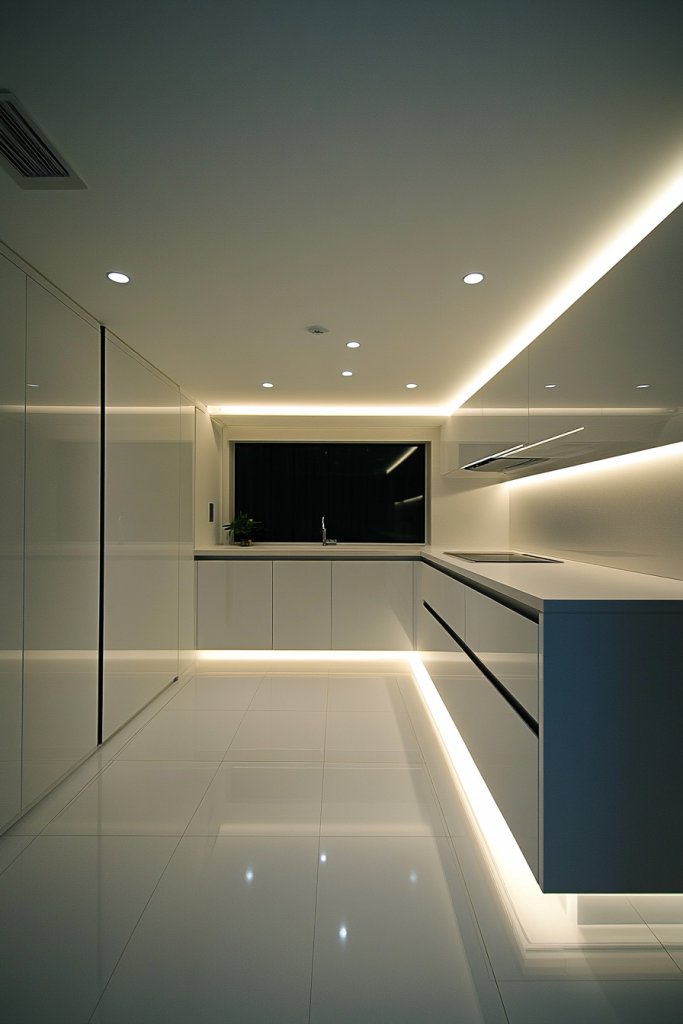 Imagine a ceiling dotted with evenly spaced, slim recessed lights casting a gentle, diffuse glow across the countertops and workspace. Under-cabinet LEDs add targeted light, making food prep safer and easier. The soft, indirect lighting creates a calm atmosphere, highlighting the textures and colors of your materials. The overall look is sleek, modern, and unobtrusive, emphasizing the minimalist ethos.