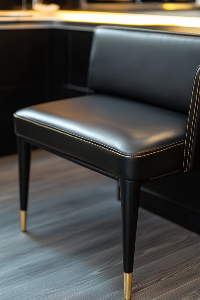 Visualize a plush black leather bench with clean, straight lines, complemented by metallic gold trim or accents. The cushions are smooth, inviting, and add a subtle sheen. Gold-tipped legs or decorative hardware enhance the luxurious vibe. Surround this setup with minimalist decor—think glass or marble surfaces—to finish the high-end look.