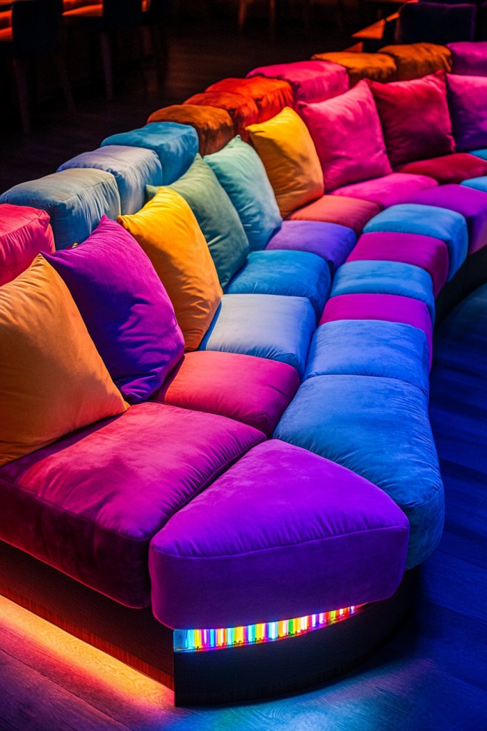 Looking for a versatile, fun seating arrangement that fosters conversation? A U-shaped banquette with multicolor cushions and ambient LED lighting can transform your space into a lively, inviting hub. It’s perfect for hosting friends or family gatherings. If your current setup feels disconnected or dull, this idea could be your new favorite feature.