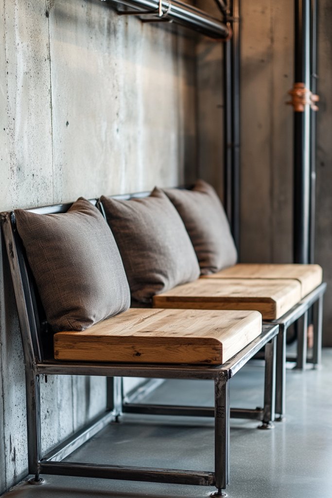 Imagine a metal-framed bench with a matte finish, paired with wooden cushions in natural tones. The cushions are simple but textured, encouraging a cozy vibe. Surrounding decor includes minimalist accessories, like wire baskets or geometric light fixtures (not pendant lights). The overall feel is urban chic with a welcoming touch, perfect for casual gatherings.