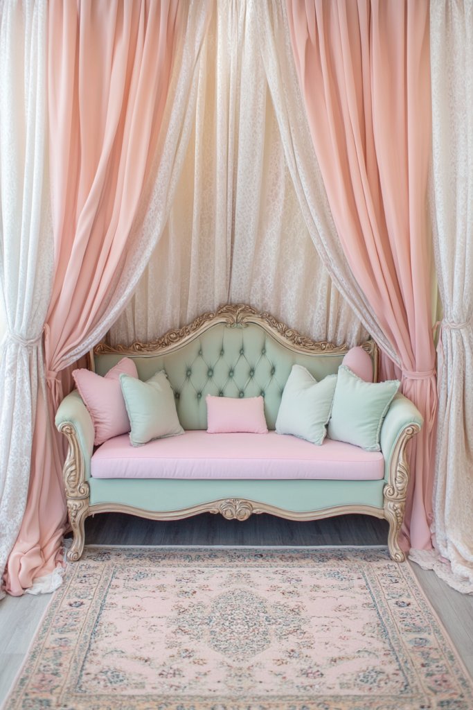 Picture a pastel-colored banquette—think blush pink, mint green, or baby blue—with sheer curtains draping softly on the sides. The cushions are plush and cozy, in coordinating pastel hues. A textured, decorative rug anchors the space, adding warmth and softness. Light filters in through the curtains, creating a gentle, enchanted atmosphere that invites relaxation.