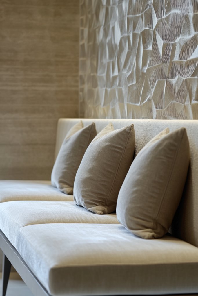 Imagine a long, streamlined banquette with smooth, upholstered cushions in neutral tones—think gray, taupe, or charcoal. Behind it, a bold wall panel—perhaps textured, patterned, or with a statement color—adds visual impact. The cushions are easily interchangeable, allowing for quick style updates. The overall look is minimal yet striking, perfect for modern aesthetics.