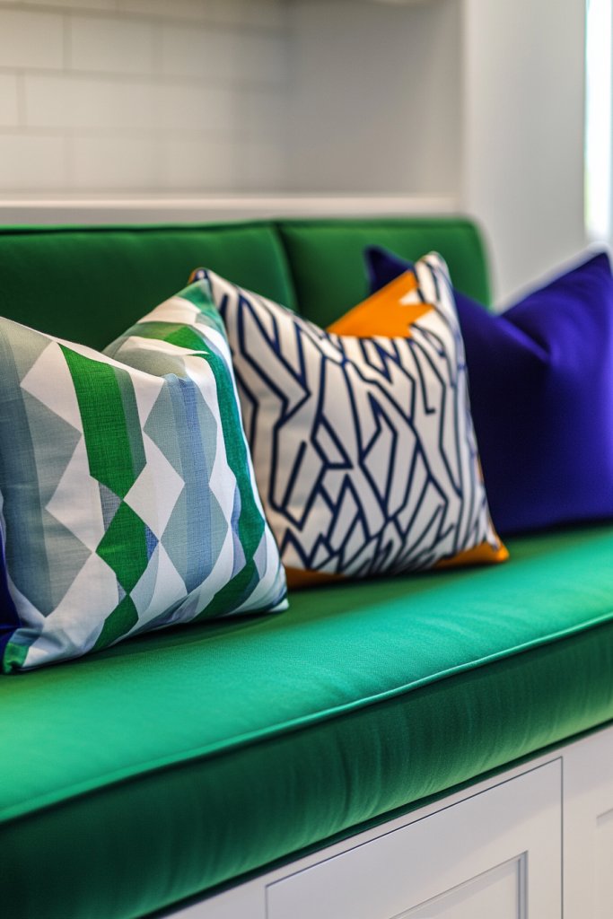 Opt for different bold hues based on your palette—think jewel tones or neon accents. Mix geometric pillows with other shapes for added visual interest. During different seasons, swap in pillows with different patterns or textures to refresh the look. Use neutral wall colors to let the banquette be the focal point or match it with bold wallpaper for maximum impact.