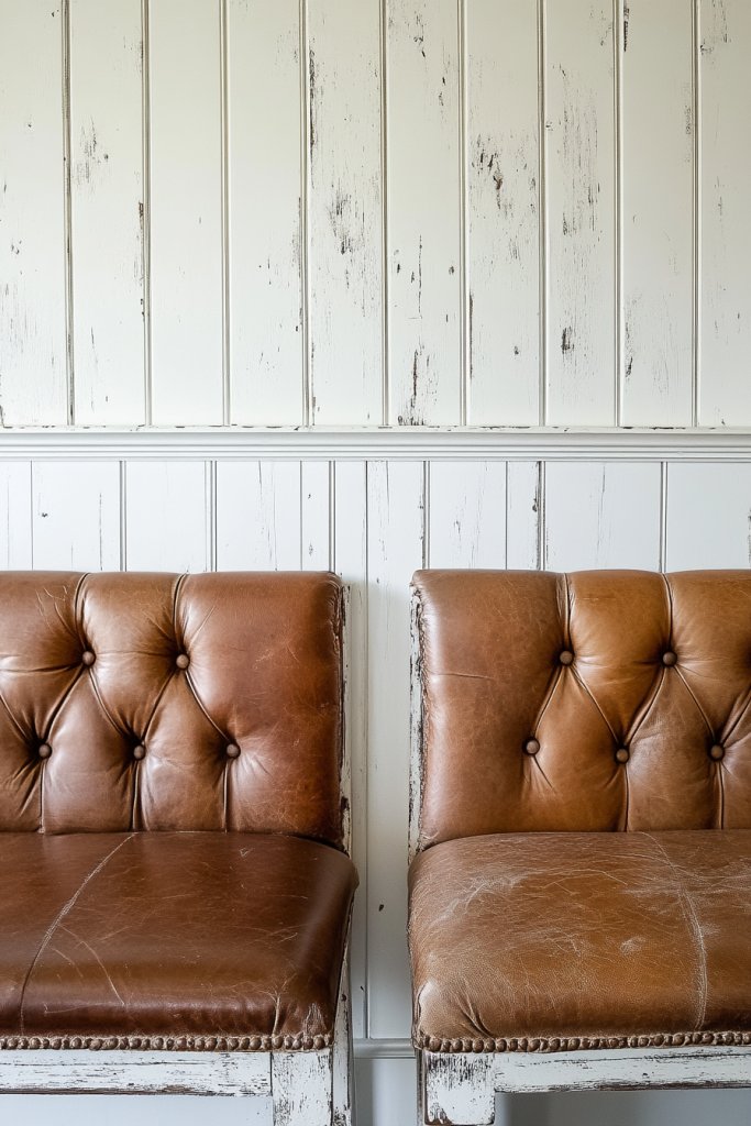 Visualize a sturdy wooden base painted in soft white, with paneling details that mimic classic farmhouse walls. The seats are upholstered in rich, dark leather, contrasting beautifully with the white finish. The surrounding decor includes vintage accessories and distressed wooden accents, creating a warm, lived-in atmosphere. Natural light highlights the textures of wood and leather, making the space feel cozy and timeless.