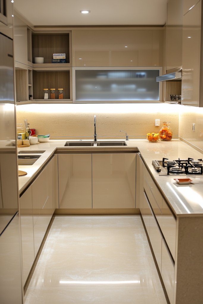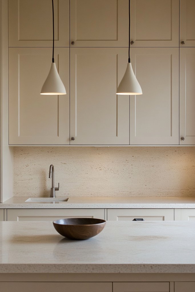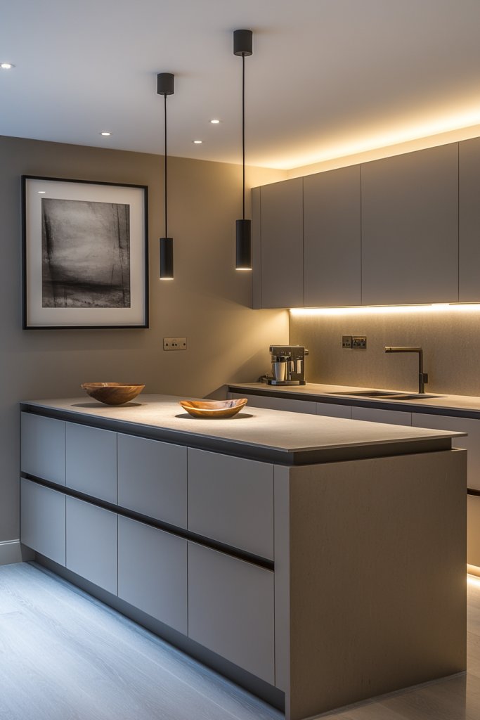 Visualize a sleek kitchen with clean lines, minimal hardware, and a neutral palette. The focus is on quality materials and subtle textures, not on excessive ornamentation. Hidden storage keeps surfaces clear, and integrated appliances maintain a streamlined look. The overall effect is calming and sophisticated, encouraging you to cook and relax.