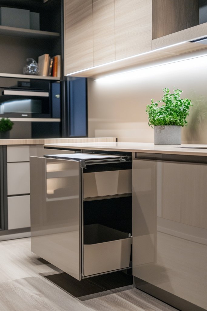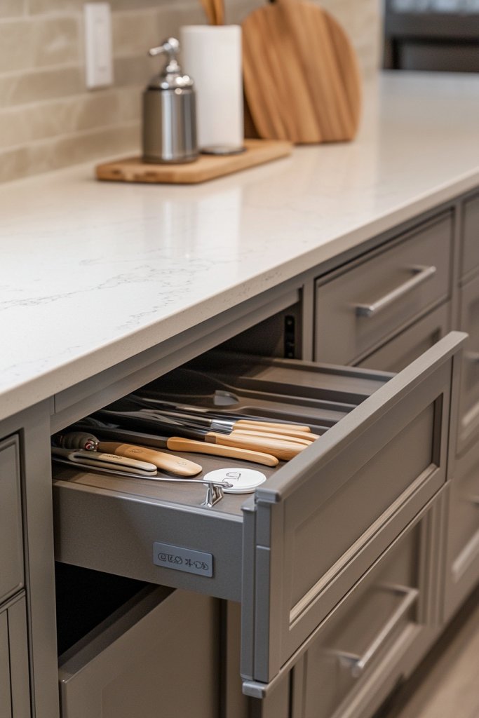 Envision sleek pull-out cabinets revealing neatly organized trays of spices, pots, and pans. Deep drawers hold bulky appliances and baking sheets, while vertical dividers store cutting boards and baking mats. Hidden compartments conceal less-used items, keeping counters clear. The entire space feels calm and functional, with everything in its place and easy to find.
