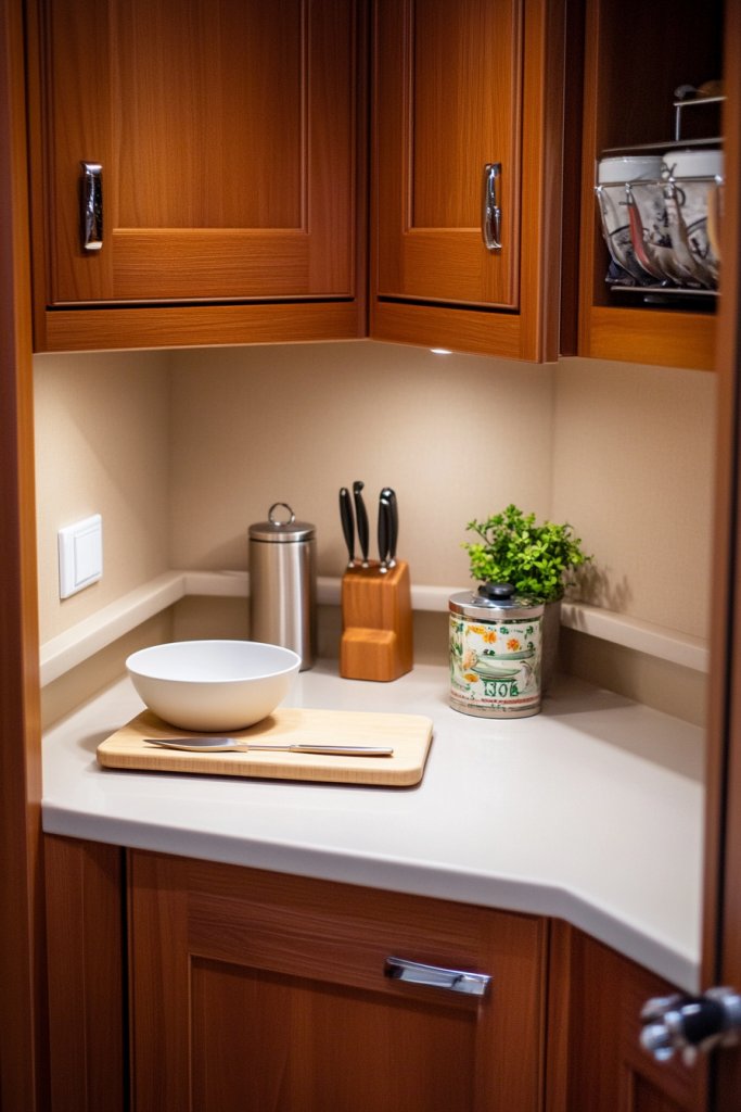 Add a pop of color with vibrant countertop accessories or a textured backsplash behind your main prep zone. Use layered textiles like a soft cream throw blanket with chunky knit texture on a nearby stool for added coziness. Incorporate built-in cutting boards or slide-out trays to keep your workspace tidy. Personalize your setup with custom storage solutions that suit your cooking style.