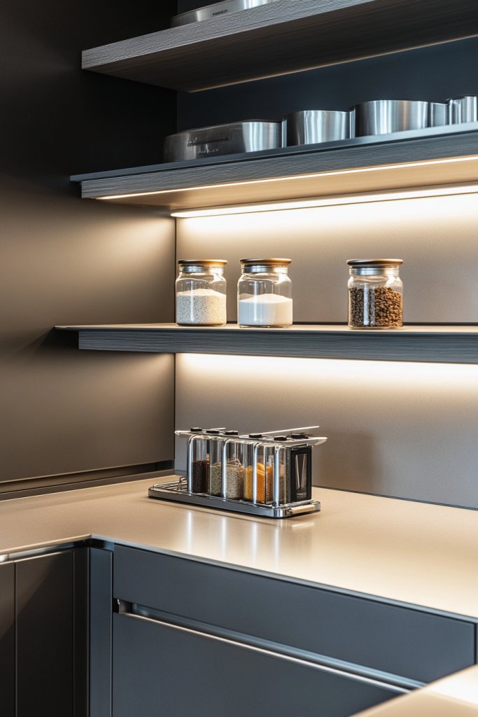 Personalize your lighting with decorative fixtures or colored bulbs for special occasions. Incorporate smart lighting systems for voice control or app-based adjustments. Use textured shades or unique materials like frosted glass or metallic finishes to add visual interest. You might also add candles or vintage lanterns on open shelves for a touch of charm during relaxed evenings.