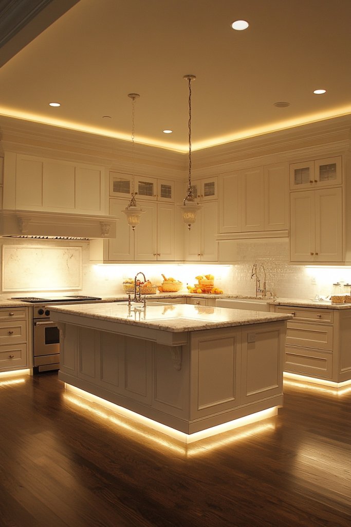 Picture a kitchen softly illuminated with warm LED recessed lights overhead, balanced by bright under-cabinet fixtures that spotlight your work surfaces. A stylish pendant adds a focal point over the island, casting a gentle glow. The combination creates a cozy, functional atmosphere where cooking and socializing feel equally inviting. Shadows are minimized, and every corner feels purposeful and warm.