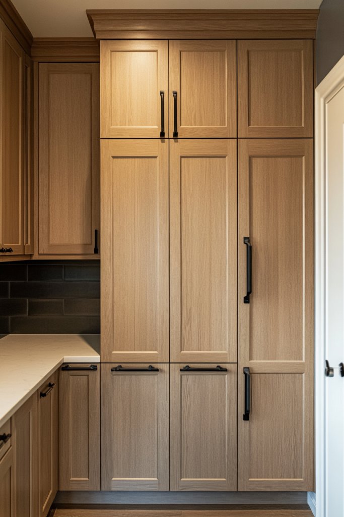 Imagine tall cabinets reaching the ceiling, with adjustable shelves for every height of dishware. Below, wide drawers store pots and pans, while narrow units hold spices and baking supplies. The layout is symmetrical yet functional, with easy-access handles and soft-close hinges. Everything has a place, and nothing feels out of proportion or hard to reach.