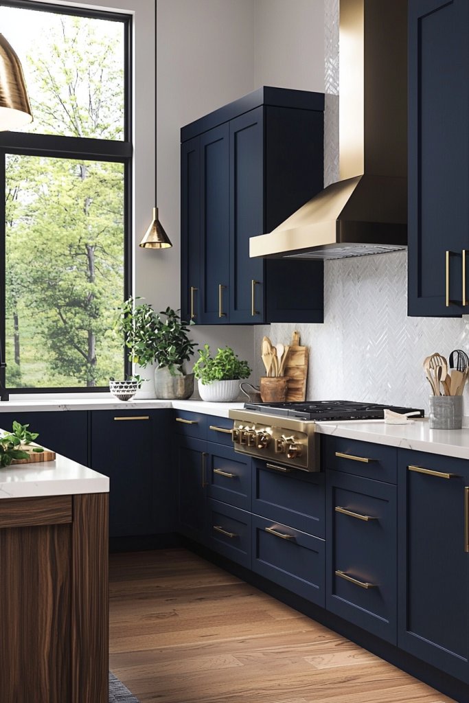 Imagine opening your kitchen door to rich, deep blue cabinets that exude confidence and style. Navy blue pairs beautifully with brass or gold hardware, adding a touch of elegance that elevates the entire aesthetic.