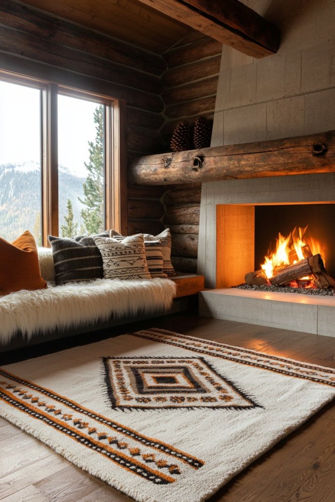 After you’ve selected your comfortable seating, layering area rugs can add warmth and texture to your cabin. Start with a larger, neutral rug as your base; its muted tones will create a serene foundation.