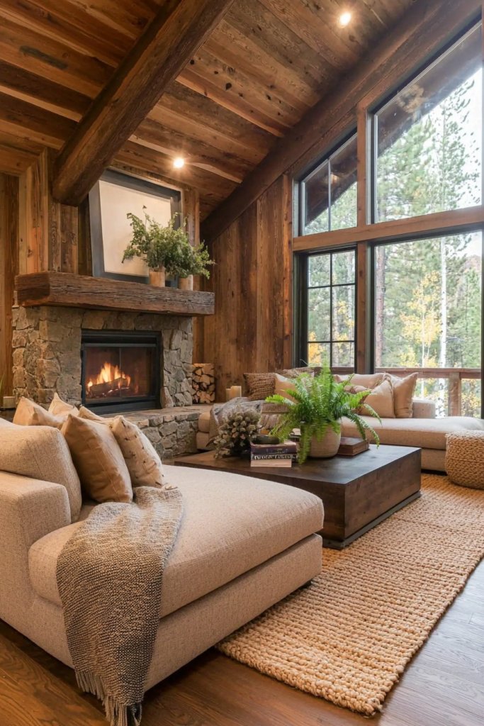 Picture exposed beams overhead, their rugged texture juxtaposed with the smoothness of polished floors, grounding the space in nature’s beauty. Stone accents, perhaps a fireplace adorned with river rocks, offer an earthy charm that whispers tales of the outdoors.