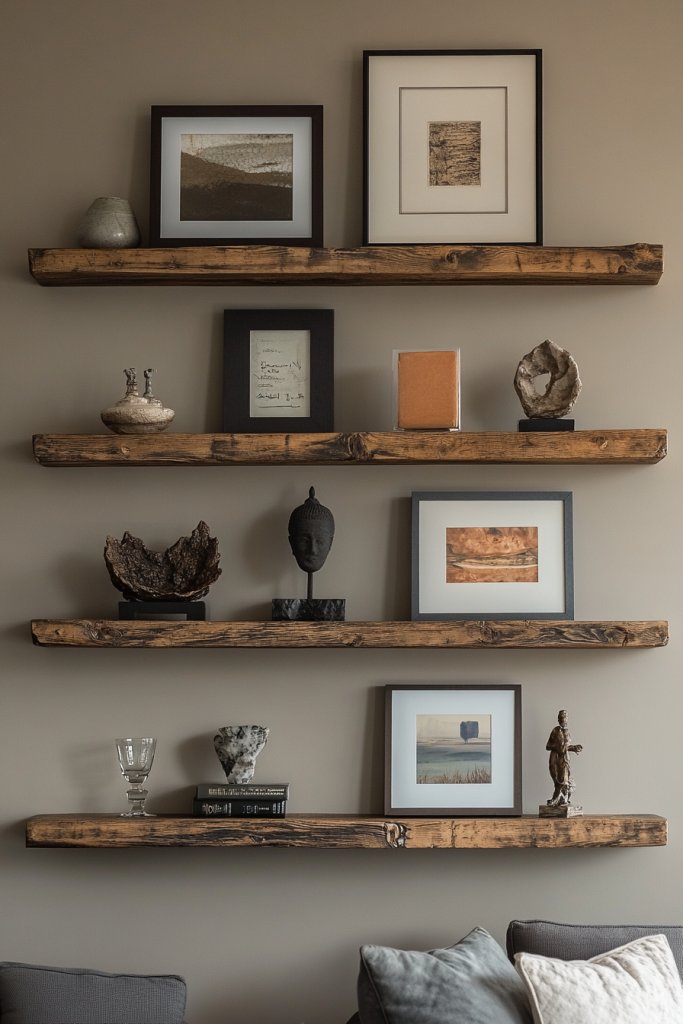 Use floating or bracket-supported shelves in different finishes—wood, metal, or painted—to match your decor. Arrange items by theme or color for coherence, or mix for eclectic charm. Incorporate plants, books, or textured objects for variety. Adjust the spacing between shelves based on the size of your decor, from small collectibles to larger framed art.