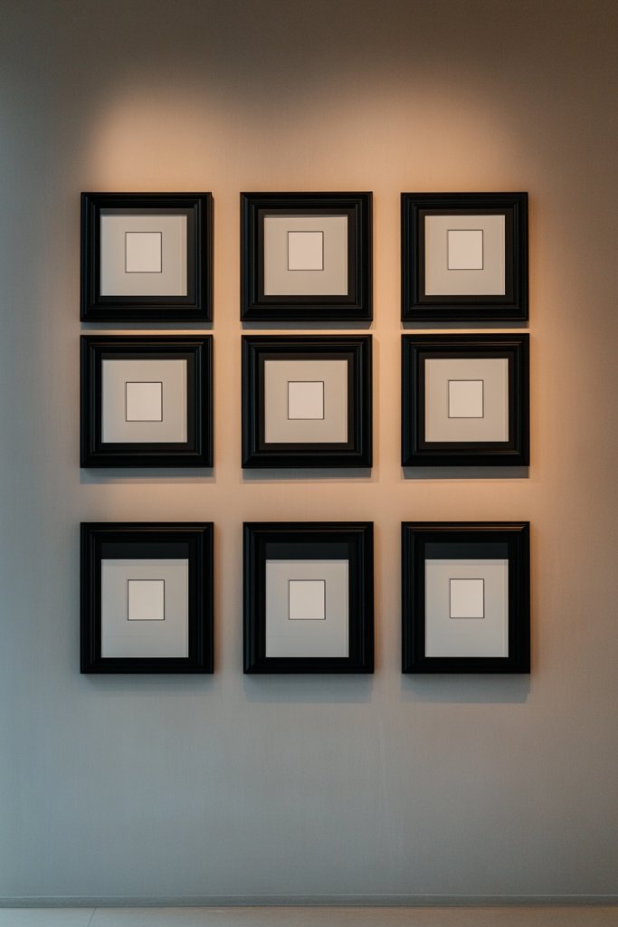 Craving a sleek, orderly wall that exudes calm and clarity? A grid pattern with uniform frames offers a minimalist yet striking aesthetic. It’s perfect for those who prefer a clean, organized look that still feels intentional. If you love modern simplicity, this approach might be your new favorite.