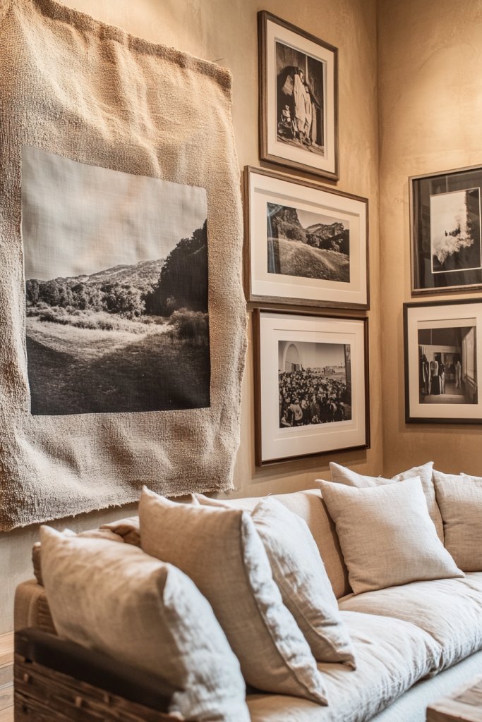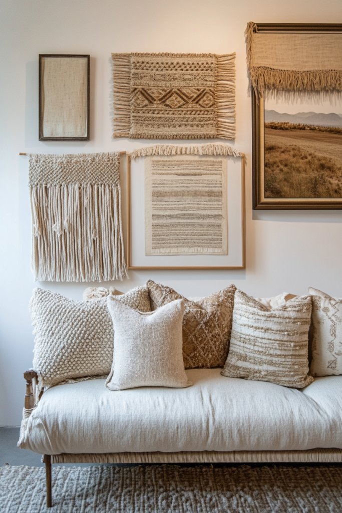 Visualize a wall decorated with woven wall hangings, fabric banners, or textile art panels alongside framed prints. The varied textures and patterns create depth and richness, making the space feel layered and curated. Natural fibers, like jute or wool, add earthy warmth, while bold textiles inject color and personality. The overall look is boho, rustic, or eclectic.