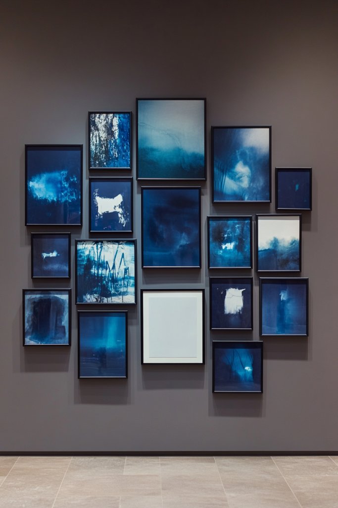 Imagine all your frames in shades of blue, or perhaps warm metallics like gold or copper. The consistent color palette creates a seamless background that lets the images shine. Inside, you can use images with similar tones or themes to reinforce the cohesive vibe. The overall effect is refined, balanced, and visually pleasing.