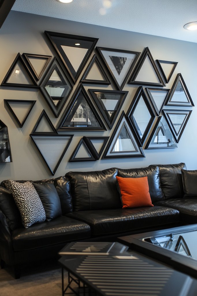 Geometric galleries turn your wall into an art installation, boosting your confidence as a creative decorator. They’re adaptable to different styles, from ultra-modern to eclectic. Once you master the pattern, you’ll find it easy to experiment with other artistic arrangements, elevating your entire living space.