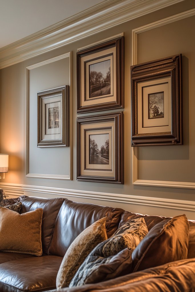 Picture a wall framed with elegant molding that creates panels or a subtle border around your photos or art. The raised trim adds shadows and dimension, making the display pop. The contrast between textured wall accents and sleek frames creates a layered, luxurious effect. It feels like a built-in feature rather than a simple gallery.