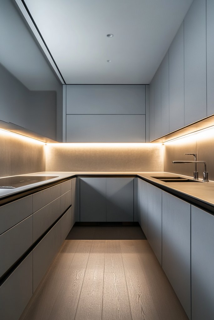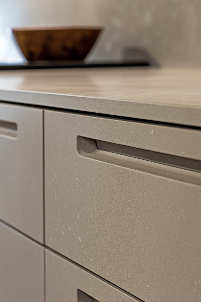 Imagine a kitchen where the cabinets stretch seamlessly from wall to wall, with no knobs or pulls breaking the clean line. The matte finish reflects soft natural light, creating a calming atmosphere. Subtle grooves or push-to-open mechanisms keep the look sleek, while hidden hardware maintains the visual flow. It’s like your kitchen becomes a modern sculpture, with every surface whispering simplicity and elegance.