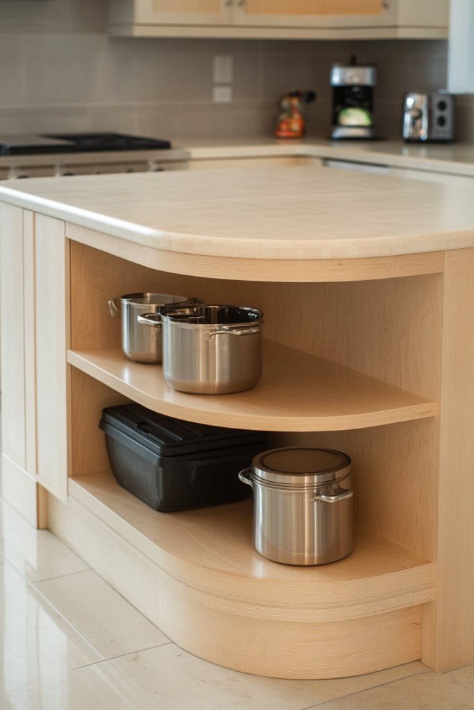 Picture a smooth, rounded-edge island made of warm wood or sleek laminate, with open shelves underneath displaying colorful bowls or cookbooks. The soft curves make the space feel more inviting, while open storage keeps essentials within reach. Pendant lighting or subtle under-cabinet lighting illuminates the workspace warmly. The island acts as both a prep area and a social hub.