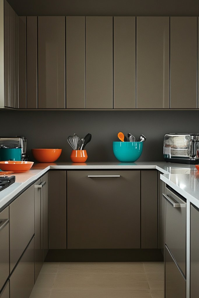 Visualize a kitchen painted in shades of gray, with darker countertops and light gray cabinets. Accents like a soft cream throw blanket with chunky knit texture or vibrant dishware add pops of color without overwhelming. The consistent color family creates a calm, balanced environment, while small touches of contrasting hues energize the space. The result? A stylish, curated look that feels effortless.