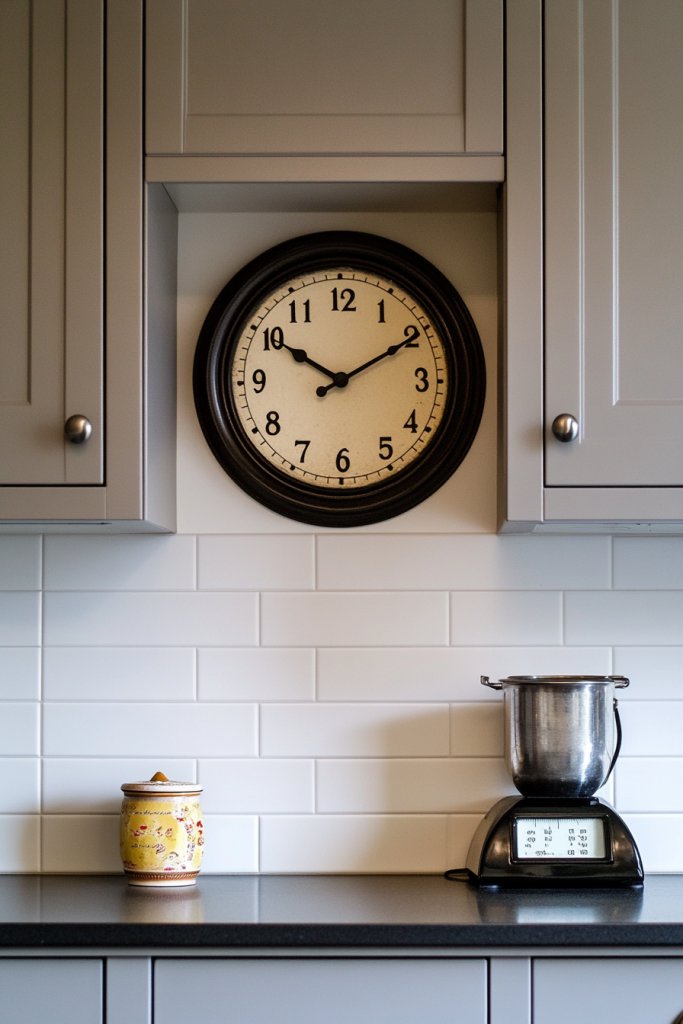 Imagine a retro-inspired clock with a brushed metal finish hanging above your sink or range. The clock’s simple, round face with bold numerals complements mid-century cabinetry. Nearby, vintage-inspired canisters or a brass pepper grinder sit on open shelves or countertops, adding layers of visual interest. These touches create a cozy, curated vibe that feels both timeless and personal.