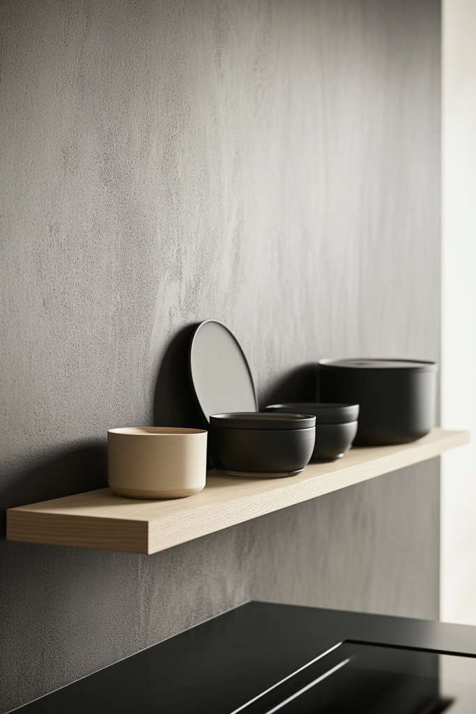 Imagine slender, wall-mounted shelves in matte black or natural wood, holding colorful mixing bowls or glass jars filled with spices. The open design invites you to show off your favorite pieces or organize everyday items for quick access. The shelves’ minimalist profile ensures they don’t overpower the space, maintaining a clean aesthetic. The combination of form and function creates a stylish, practical focal point.