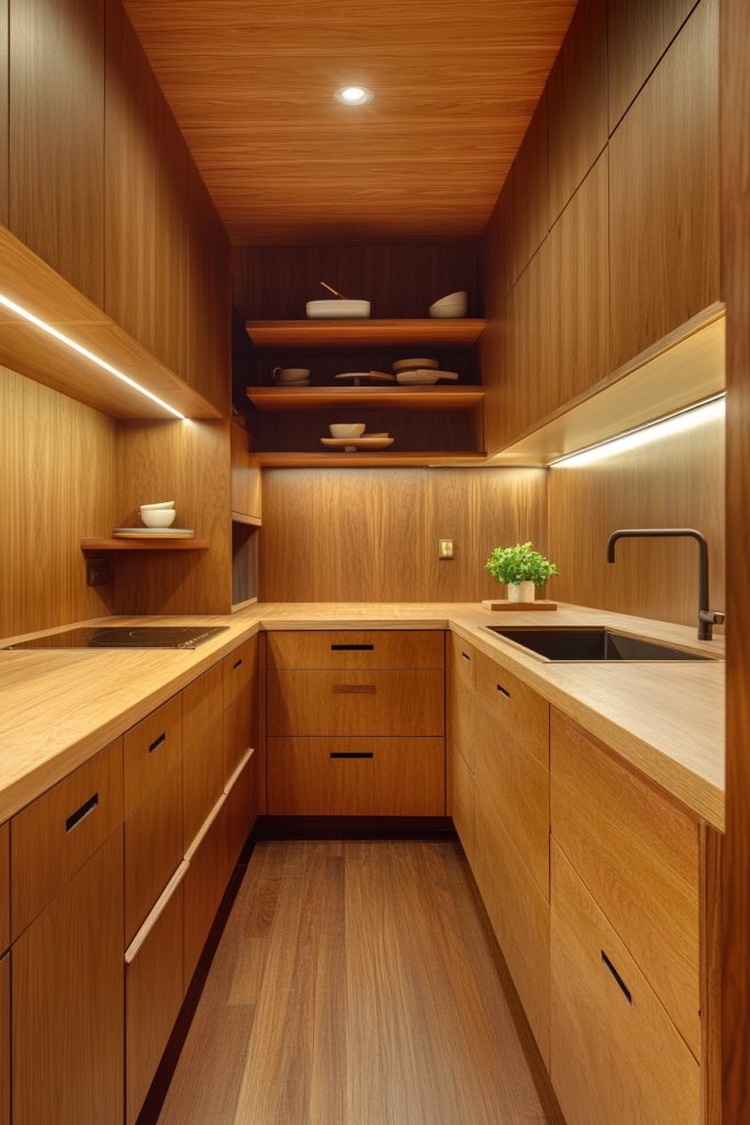 Picture cabinets made of rich teak, oak, or walnut, with visible grain patterns that add texture and depth. The matte or satin finish enhances the natural look, allowing the wood’s character to shine. Pair with open shelving displaying rustic ceramics or woven baskets. The overall effect is warm, tactile, and full of life—a space that beckons you to cook and linger.