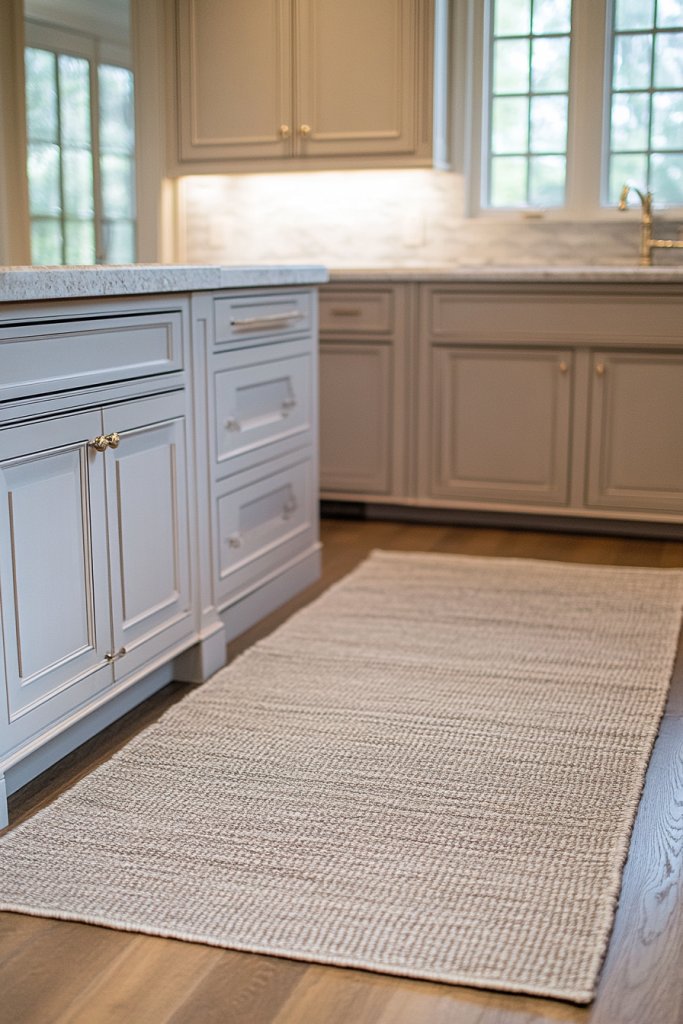 Looking to add warmth and define your kitchen area without overwhelming the design? Textured or patterned rugs in neutral tones create a cozy, inviting atmosphere while anchoring your space. They soften hard surfaces and add visual interest. If your kitchen feels too cold or flat, this is a subtle yet impactful upgrade.