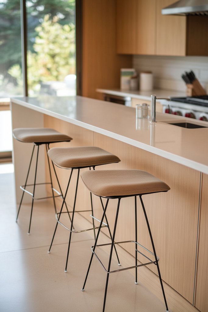 Visualize a row of slender, tubular metal stools with rounded wooden or upholstered seats. The minimalist design emphasizes clean lines and open space, making even small kitchens feel less crowded. The combination of matte black or brass frames with warm wood or vibrant upholstery creates visual harmony. They invite you to sit down and relax, all while looking effortlessly stylish.