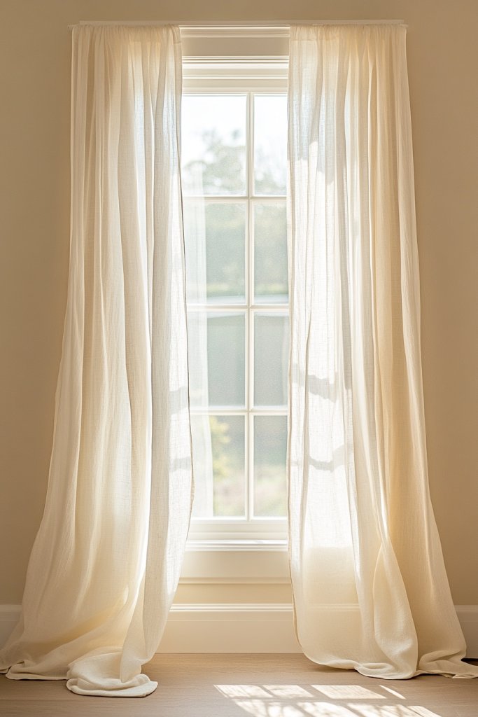 Picture sheer, white or soft-colored roller blinds or curtains flowing gently in the breeze. The translucent fabrics filter sunlight softly, creating a bright, airy atmosphere. The clean, simple lines of the window coverings emphasize the room’s uncluttered aesthetic. When pulled back, the windows become a focal point with uninterrupted views and natural light flooding in.