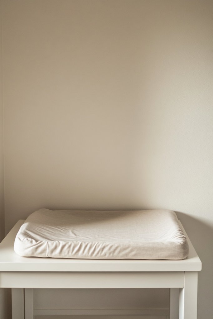 Visualize a smooth, unembellished changing table in natural wood or painted in a muted tone. The plain, firm-changing pad sits securely on top, free of unnecessary accessories. The surface is clutter-free, with only essential items within reach—like a small stack of wipes or a clean diaper in a simple holder. The overall look is clean, organized, and modern, emphasizing function over decoration.